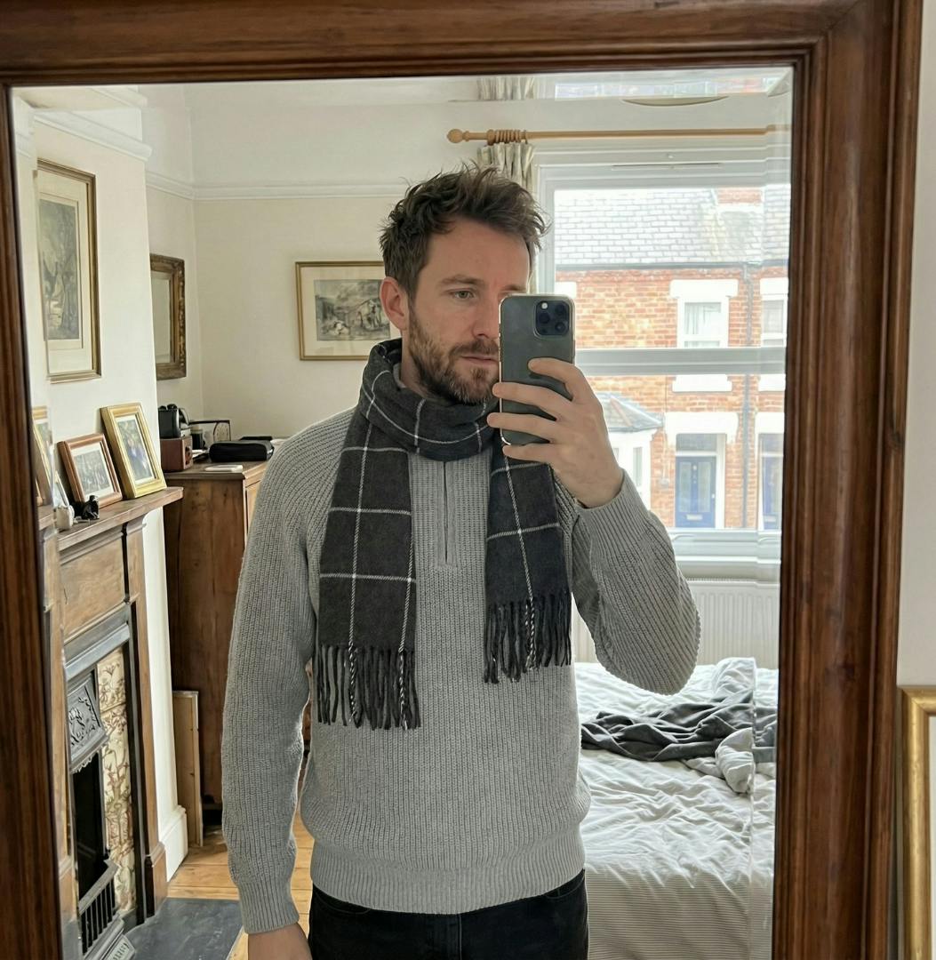 I struggle to find jumpers that fit my arms and shoulders without being baggy at the waist. This one fits spot on. The scarf feels premium, not that cheap scratchy stuff. Very happy with the bundle.